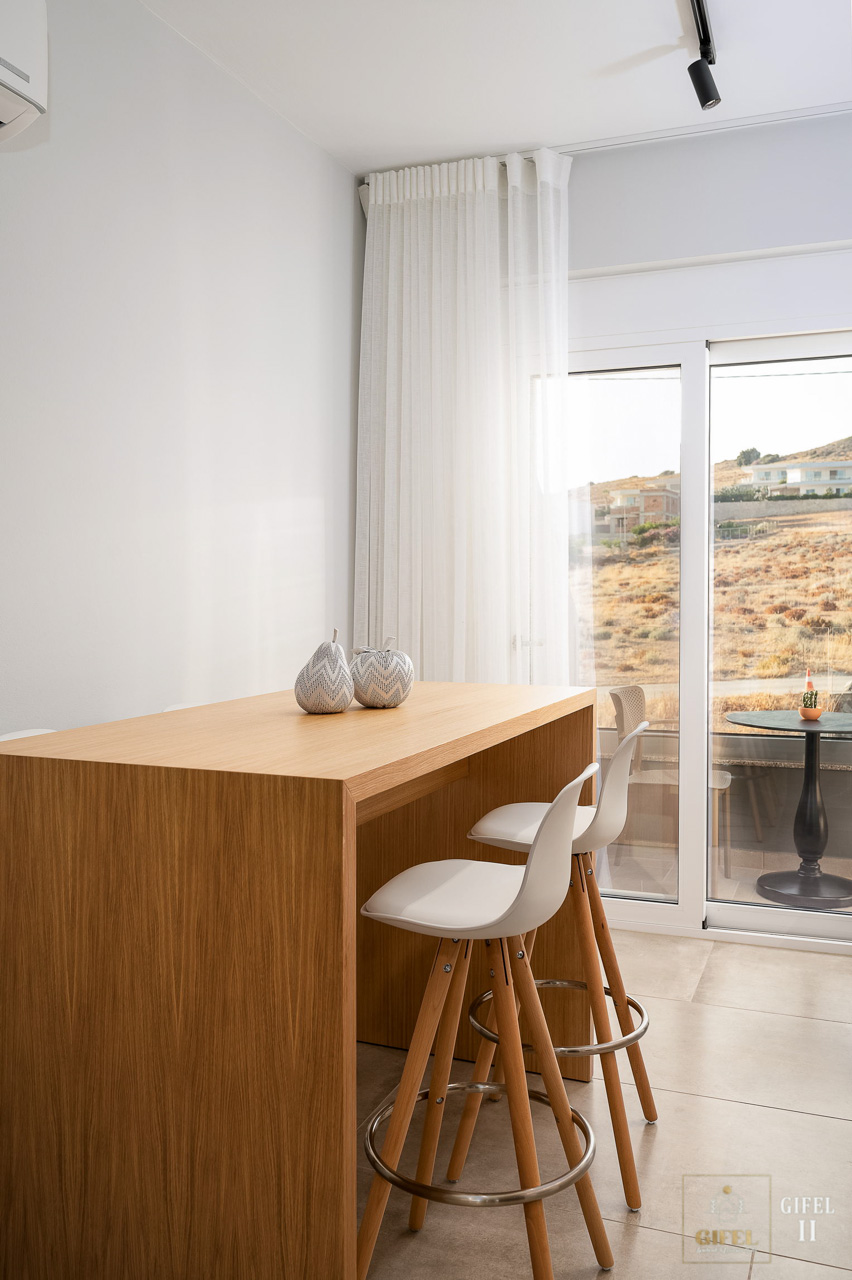 GIFEL Suite II is a newly-built apartment on the first floor of the GIFEL Luxurious Suites complex. The bedroom is equipped with a king-size bed with an orthopedic mattress for a comfortable sleep, and is decorated in soft and natural colors.