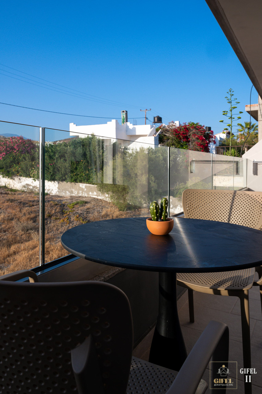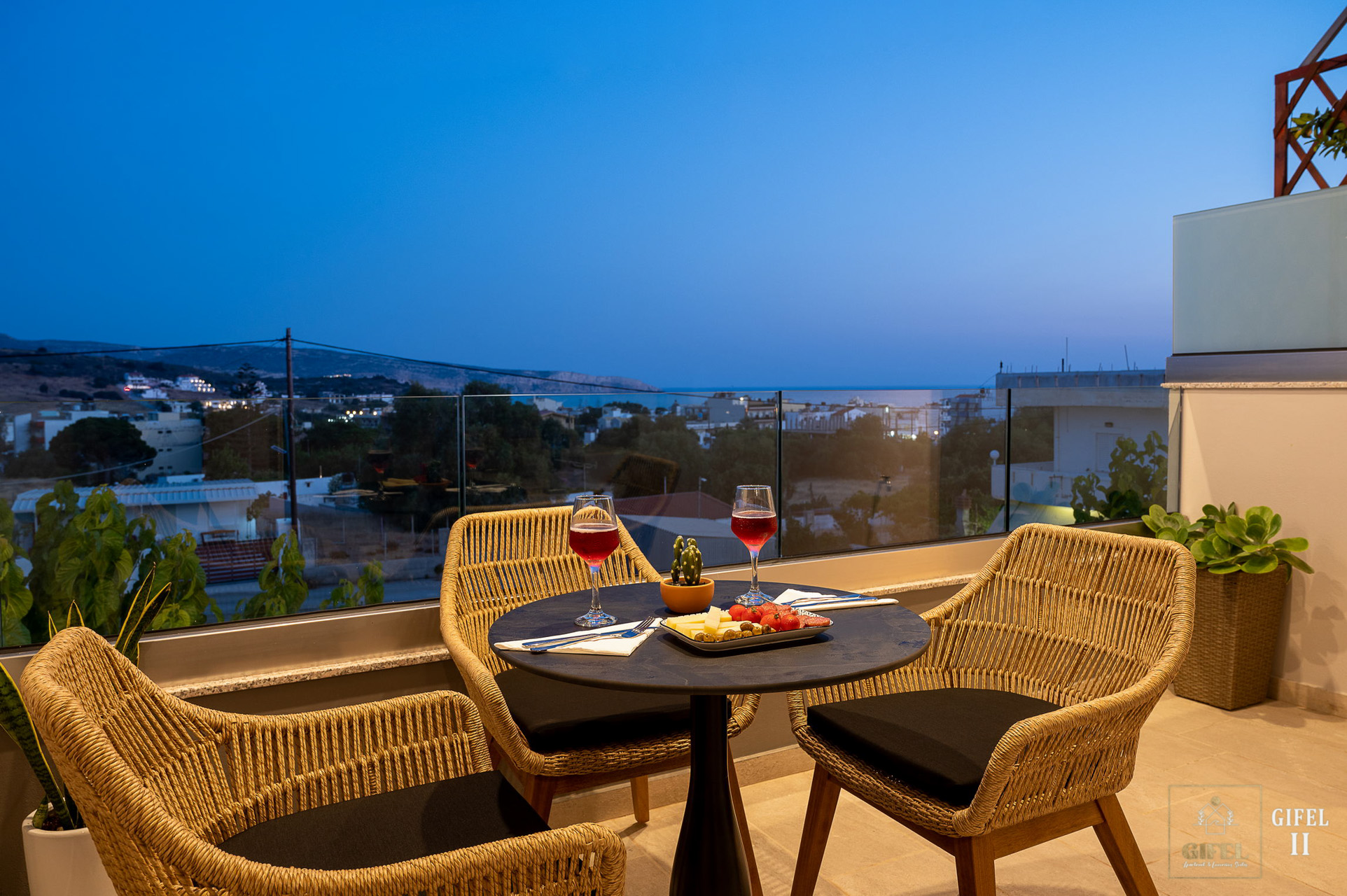 In the bathroom you will find a luxurious shower cabin, towels, hair dryer, toiletries and a washing machine. GIFEL Suite II has amazing view to Kalamaki and the Libyan sea and on its balcony guests can enjoy their drink or meals.